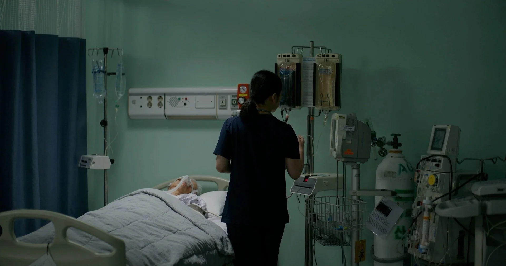 병원에서 홀로 의식 없는 아버지를 부양하며 지내는 간호사 선영 (46, 여).